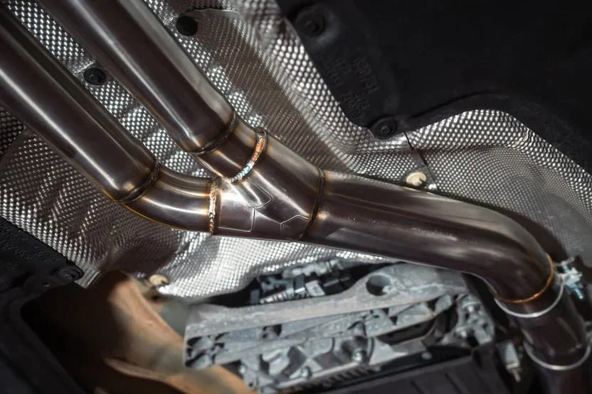 الاكزوزت يجي بتشطيب فخم وبيلمع تحت السيارة، ويعطي لمسة رياضية مع الخطوط الهجومية للـ G30. النظام مصمم عشان يكمل شكل السيارة ويضيف عليها لمسة فخمة.